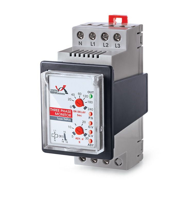 - در صورتیکـه خطاهایـی (مانند جابجایی فازهـا، افزایش ولتاژ، کاهـش ولتاژ و قطع فاز) در شبکه سـه فـاز پدیـد آید، سیگنال خطای مربوطه روشن شده و دستگاه شروع به شمارش زمان تاخیر در قطع می کند. پـس از اتمام شمارش، سیگنال OUT خاموش شده و رله داخلی دستگاه قطع میشود. (اتصال داخلی ترمینال ۱۵ بـه ۱۸ وصل میشود.)